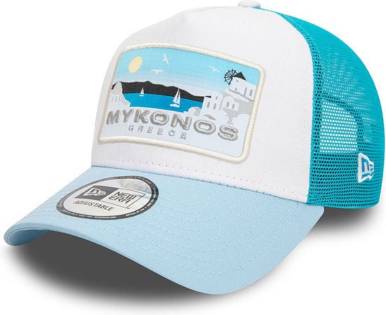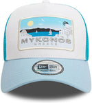 New Era Summer Mykonos A-Frame Trucker Cap Mykonos Greece graphic patch on front New Era Flag embroidered on left Structured crown Snapback Curved visor Mesh back and sides 50% COTTON,...